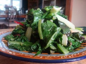 Add olive oil, butter and minced garlic to pan over medium heat. Add chopped stems from Swiss Chard, bok choy and komatsuna first to soften. Then add all the leaves chopped. Cover and render down for just a few minutes! Salt and pepper to taste. A very quick, delicious and nutritious lunch indeed!!