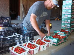 Our strawberry patch is nestled in between a beautiful crop of our spelt wheat. Snakes, mice & our cats are having a lot of fun out there! Our first pick was Tuesday, June 8th this year. The crop is bountiful! We have two varieties, an early and later variety. Generally early berries are not super sweet, so don't worry if your first savor of the year doesn't prove to be the 'sweetest'. With heat that June should throw, berries sweeten up later on in the month. Ben and I have our berries picked into our white 3 litre baskets, then we grade them into the green quarts you see at market. (Quality control you see!) We've bought our own boxes/flats this year to re-use and re-use again! They then head into our cold storage the day before market to stay 'cold' before the trip to the city! We've ordered 20,000 more plants for this year, so another patch will go in (**another new variety we want to try for 2011!) as generally when a patch reaches two years, it begins to die off and not produce. Enjoy the harvest! Kera our Wychwood helper is heading to the farm with her 'food machines' - a turbo blender to make smoothies and an ice cream maker! I will make the daquiris!! Ben and I are currently enjoying blended Strawberries, Avocado and a bit of Bee's Universe Honey for breakfast! I will be freezing a ton of these guys to enjoy come winter as part of my new 'preserve the seasons' weekly task.