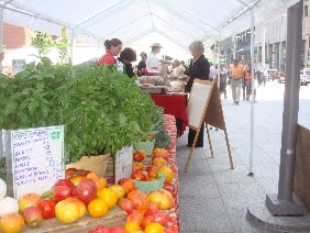 Well, we've got a new addition to our busy schedule! The new 'Bay & Adelaide Farmer's Market' put on by Evergreen ( Go to Evergreen! ) and will run each Thursday from 11:00am until 2:00pm. We'll sell until 1:30pm, as we've got to hike it over to the Dufferin Grove Organic Market ( Go to Dufferin Grove Park! ) to set up and sell from 2:30pm until 7:00pm. The Bay & Adelaide space really did need some 'greening' up and the business folk who look down at us from their office towers seem very interested in what is going on! Not only can you find our fresh produce at this market but the best honey, Merchants of Green Coffee, Monforte Dairy, Chocosol, Bruno and his mushrooms, excellent food from Brian Burk Wine Bar, Jamie Kennedy Fries, all vegan and raw foods from Hearty Catering and the list goes on. Grab a coffee, or an ice coffee, lemonaide, gourmet lunch, cheeses, fresh bread, fresh organic produce all during your lunch hour! Your air conditioned office space will keep her cool until quittin' time! The Bay & Adelaide market will run until September 9th, so please come and enjoy! Dufferin Grove continues to be a winner for our farm. A great atmosphere, great people, droves of familar faces and returning customers week after week, year after year. This market continues to keep 'the organic aspect' alive and well. Our farm volunteer Tomhas (pictured in the top pic!) has been with us almost 3 weeks and he's leaving us this weekend! The time went by fast and he did a great job! Thank You Tomhas!