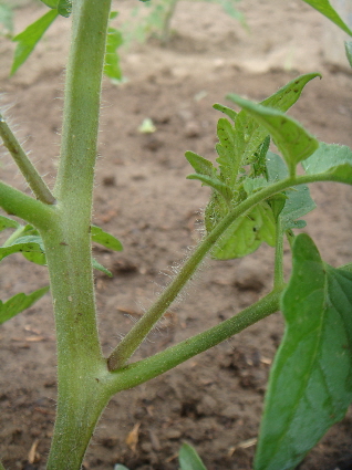 Now, not all tomatoes are created equal! Not all 'suckers' are created equal. Take the above photo. There is a sucker growing from the tip of a set of blossoms! Remove these as well. I also find that if you grow 'striped german' or 'striped marvel', typically any of the yellow, marbled flesh ones they like to throw a set of blossoms in a V stem and throw two suckers at the same time! You must choose a 'leader' and remove the other stem/sucker. Have fun! Tomatoes are forgiving. Often time while stringing, my 'gentle' hand that is never trying to go too fast snaps the top right out of the tomato!! It eventually throws another sucker and keeps going!