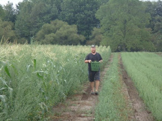 What an August! The bad news is sucky field tomatoes once again. The late blight is back with a vengeance. This means we will not be able to offer the Romas for sauce in bulk for the duration we know people expect. We are accepting bulk orders now and for the next two weeks but that will be it. This is very disappointing and another financial loss. We were truly hoping that after two years we would have some luck with organic field tomatoes.....nope. The 'covered field' tomatoes are okay however, meaning we will have the heirlooms to offer well into the fall season! Our Sweet Corn is doing wonderful! We are happy to be educating folks on the reality of growing organic sweet corn and the price we need to get in order to make it worthwhile to grow. The concept of cheap sweet corn is very, very wrong. Corn is a heavy feeder and pulls a ton of nutrients from the soil. As organic farmers being able to offer this crop means we have to be very careful with the land after a year of corn to build it back up to keep the land healthy. We are happy that our customers understand this concept and are willing to pay us a fair price for our corn. We are also happy everyone understands that organic corn comes along with 'little wormy friends' from time to time! A friendly Jamaican customer at Dufferin remarked: "My mother told me not to trust food unless the creatures of the earth try it first." I like that advice! Our corn is an all yellow, smaller kernel, sweet corn that receives a ton of praise at market. Look out for various chefs using our corn at markets this fall.