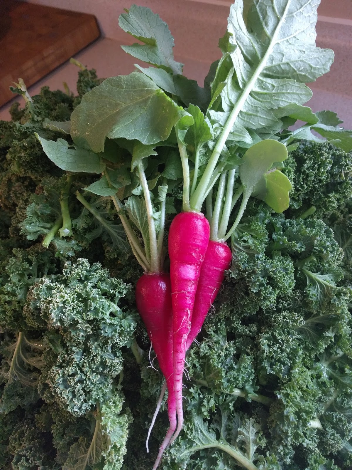 A special early treat this year is overwintered KALE! We didn't plan for this, didn't mulch it, the weather conditions turned out to be just right and our beloved Darkibor Green Curly Kale is growing back beautifully!! Look for it on May 7th at Brickworks and at Dufferin Grove too of course!